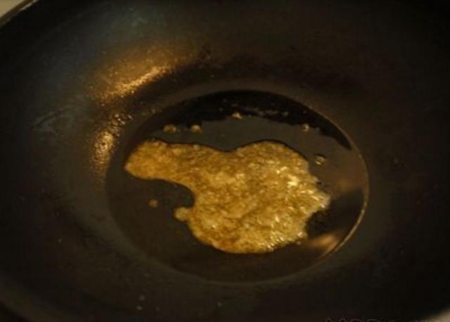 2/然后,开小火轻轻搅拌,糖融化以后,油面上开始起泡,注意颜色,红棕色,油糖开始冒泡就说明火候差不多了。