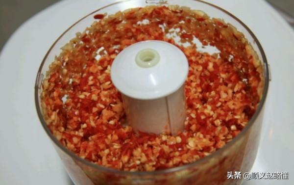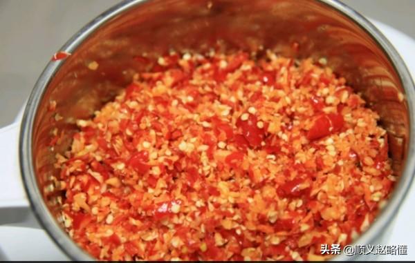 第五,把事先准备好的大蒜剥皮切成蒜沫,把红辣椒切成辣椒块,一起放到碗里,具体操作如下图:
