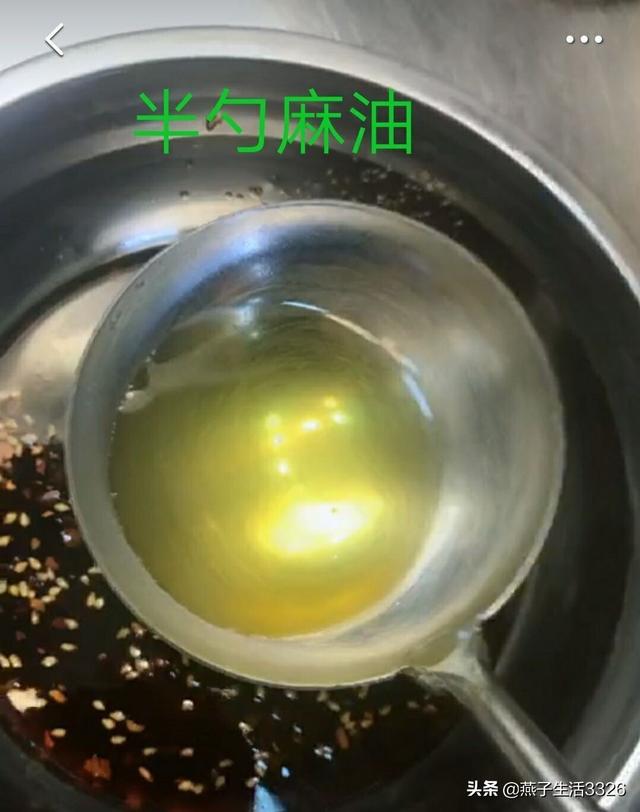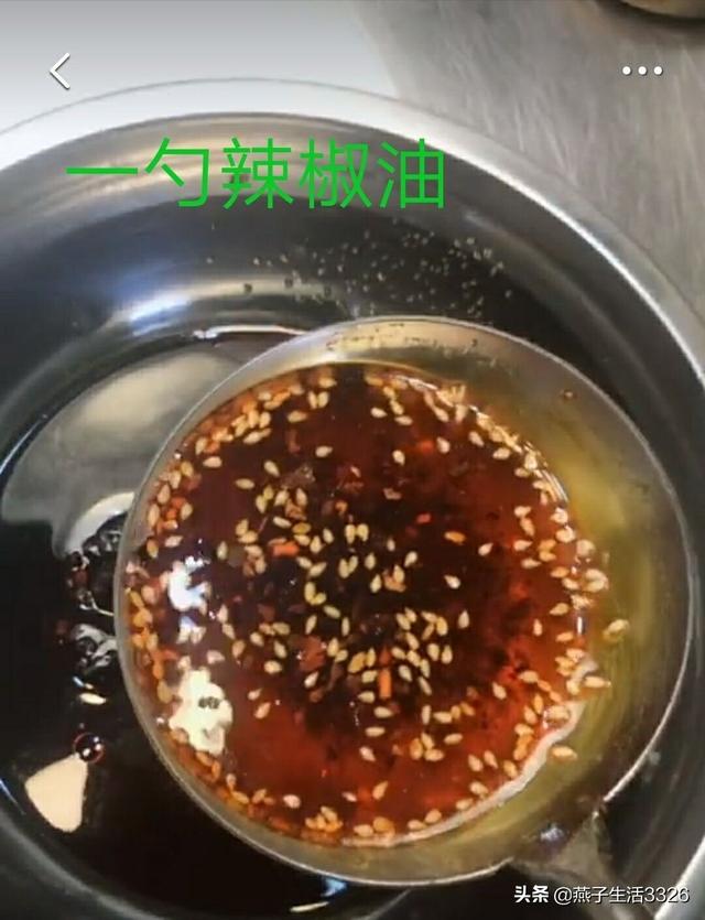 第四,把辣椒油加热,然后取大半勺辣椒油和少许麻油倒入碗里,量的大小看下图: