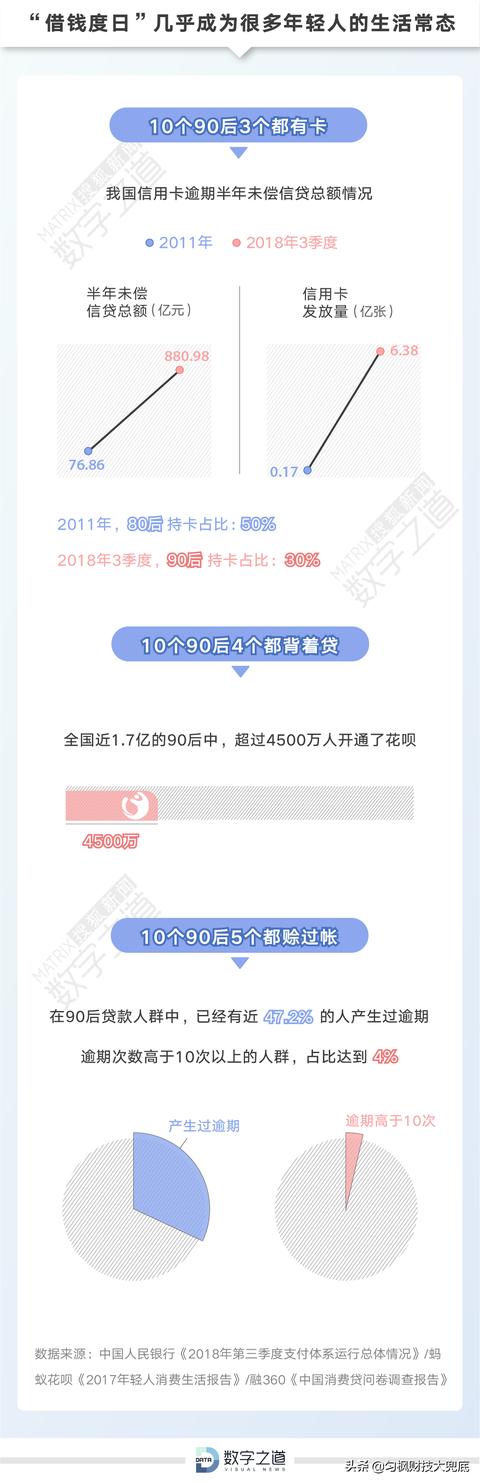 据汇丰银行的一项调查,中国90后的负债额是月收入的18.5倍,人均负债已超过了约12万人民币,主要负债来源是信用卡及各种贷款机构。而且据统计在90后借款人群中,已经有接近47.2%的人产生过欠款逾期,欠款预期次数高于10次以上的人群占比达到4%。具体看下图。