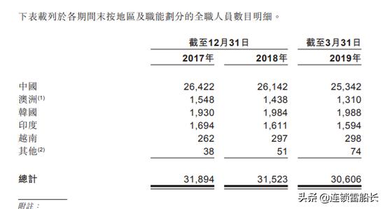 首要的是员工数量。在2019年短短3个月时间,百威亚太进行了人员的小幅度优化。招股书资料显示截止2019年3月31日的全职员工总数为3.06万人,相比于2018年末的3.15万人下降约3%。