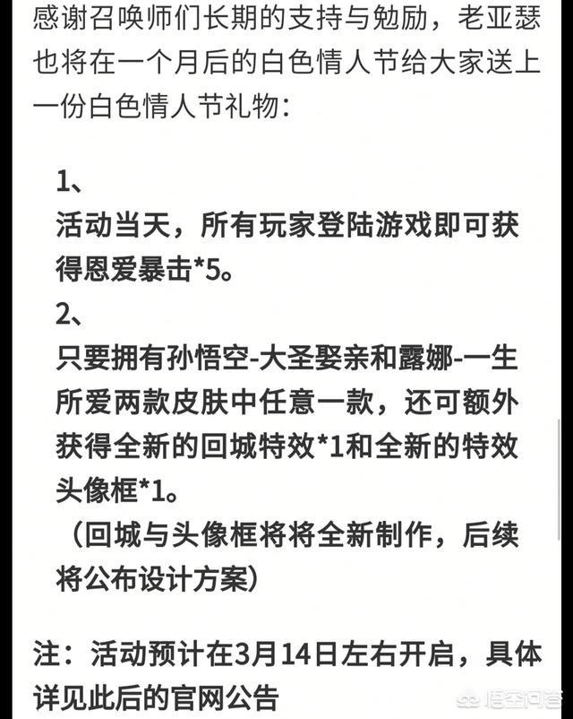 3月14日那天,登录可获得恩爱暴击x5,买了孙悟空或者露娜情侣皮肤的,则可以得到新的回城特效以及头像框。