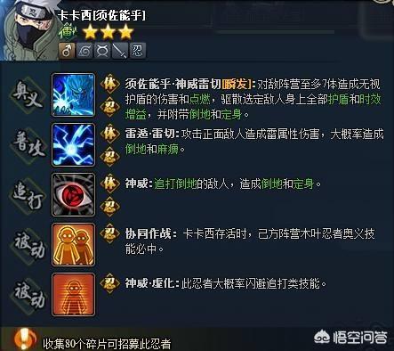 因为《火影忍者》手游里的很多技能和立绘都来自OL,所以基本上可以参考下图OL里的技能介绍,奥义必然是须佐能乎·神威雷切,至于两个小技能就不太好说了,万年雷切和神威吗?因为在神卡的技能设定上就已经融入了多变的二技能和一技能神威,如果在须佐能乎的卡卡西身上想要玩出新花样其实并不容易。