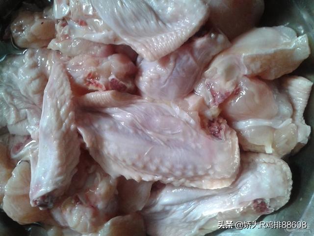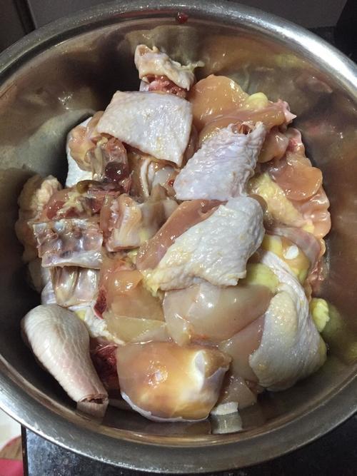 准备10斤鲜鸡腿,清洗干净切成大小均匀的小块,放入水中泡出血水,后备用。
