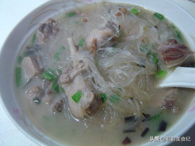 客家粉汤材料是拿二根家猪的筒骨熬两个小时左右来做高汤然后再放入手工粉条,粉汤煮好了再放入事先准备好切好芹菜跟油炸过的蒜蓉。