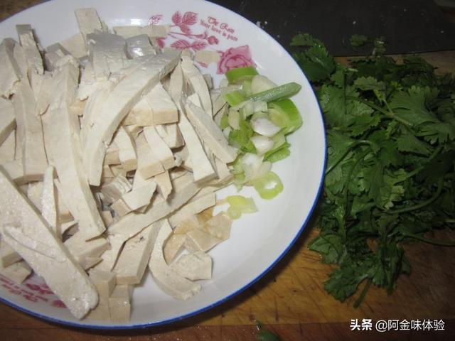 豆腐一块切细丝,葱蒜切末,香菜切一寸的段
