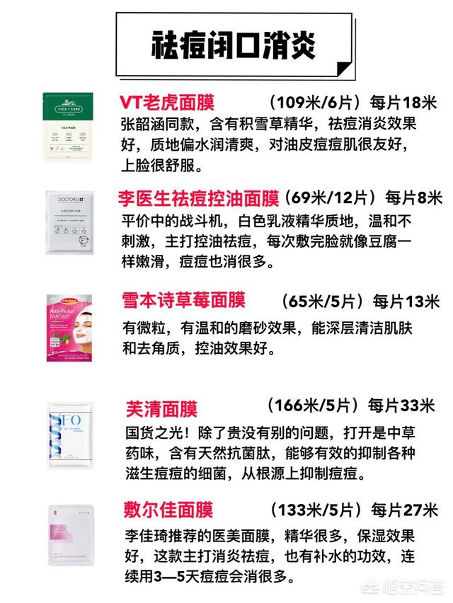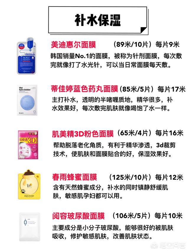膏体面膜:膏体比较厚重的容易闷痘,油皮慎用,巨干皮肤可以用的,类似于急救面膜这样的膏体比较薄的适合夏天用,尤其是晒后修复,清清凉凉的,很nice~贴片式面膜:我觉得最补水类的靠谱,毕竟面膜大多数不是很贵,还是可以做到基础的补水的类似于什么美白的、祛痘的我不行,10几块钱的面膜功效这么强大吗?持怀疑态度