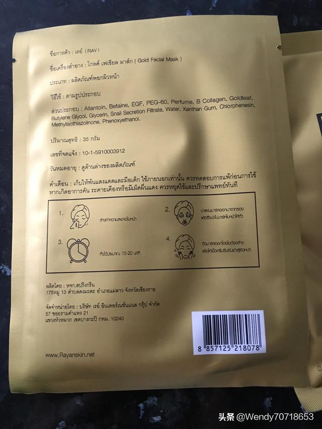 这款泰国出品RAY金色面膜本人强力推荐,补水保湿之余兼具美白抗皱,成分除了有蜗牛原液等,还有骨胶原。每星期敷二次,每次贴上面后,包装袋内的美容液还可以用来护理颈部肌肤,一举两得!如配合良好的生活习惯,效果则更显著最暖心的是价钱尤其贴地,超值之选!