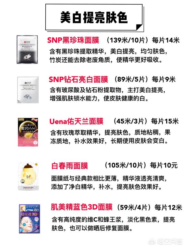 如果皮肤不是很黑或者很暗黄的,我个人是不建议用专门美白的面膜,会比较干。可以用玻尿酸原液类型补水面膜,这个含水量比较高,补水的效果会更好,而且皮肤会很透亮很有光泽。