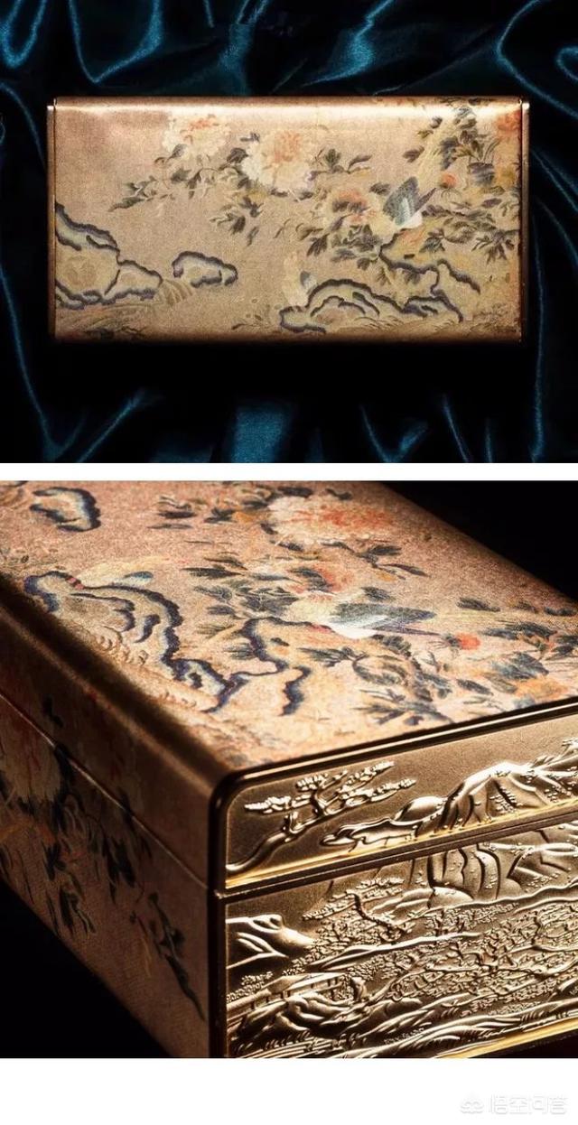 下面这个的锦盒采用的是磨绒材质,是一种古时候女子会经常用来制衣的材质,冷金色充满了清宫色彩。