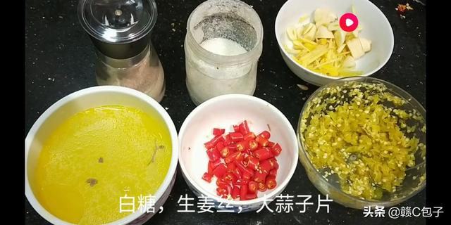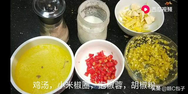 2、把鸡改成一块,鸡汤留下。小米椒六个切成圈。泡椒剁成蓉,生姜切成丝,大蒜子切成片
