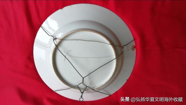 上面这个是嘉庆或者道光年间的青花大盘子,它是青花盘子,不是豆青釉的,它的上面有着原装的欧洲人用金属丝做的挂架,所以我这里只是做个示范。好让读者能看到欧洲人当时是怎样珍视我们华夏文明的,在当时的欧洲有中国的好看瓷器那是家里比较贵重的陈设器。