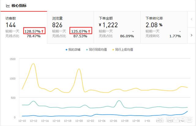 全员执行下来后,第二天在后台查看数据,访客数比前一天提升了128.57%,浏览量提升了125%,看来效果不错。