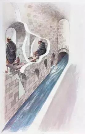 “水厕”是一种在河流边或岸边用石块或者柳条修筑坐坑的一种厕所,一般石坑洞下就是河流,排便之后利用涨潮或者河流的流动把粪便带走,“水厕”在当时是比较讲究的的修道士们解决如厕问题的办法,但是“水厕”也有很大的弊端,毕竟后来欧洲人口多了之后,河道里全是粪便,饮用水源受到极大的污染,甚至后来的“黑死病”的爆发也与这种极差的卫生环境有关。