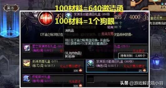 从这里呢,我们可以看出,虽然1个狗眼和100张邀请函的价值是相同的,但在100级版本兑换深渊票的过程中,邀请函的价值是远远不如狗眼的。 这其实很好理解,狗眼属于不可交易物品,而邀请函则属于可交易物品(挑战书可转换邀请函),所以邀请函相对来说并没有那么珍贵,两者之间的兑换币大概为:1个狗眼=400张邀请函。 换句话说就是,假设,我们可以用400张邀请函,转换成1个或者2个狗眼,那么我们就是赚的!