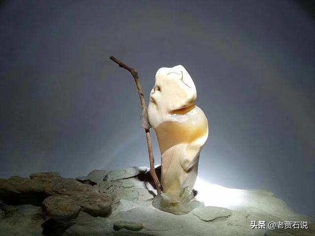 初玩之时,对石头的理解还不甚到位。有一次,将随手捡的石头,因感觉不甚喜欢,随手送给了老杨,回家后,几个石友在交流时老王命名为刘姥姥,瘦弱的身形,手持拐杖,形神俱佳,一下子这块石头就活了,我甚后悔!至今,想起它就成了一块心病!(见下图)