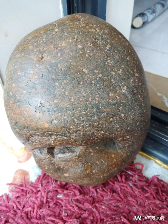 这块奇石,是我前几天去江边散步时发现的。它上部浑圆硕大饱满,下部一目微闭,一眼圆睁,嘴唇紧绷,就像一个人在放眼洞察世界,又像在沉思。越看越像,越看越觉得有意思,就把它抱了回来,放置在书桌上。以后的每天,我都要看它几眼。每次看到它,我就会产生一种异样的感觉,就觉得好像它在不断的提示我,多看观察多思考话要少。这时,我的心就会沉静下来,不为纷乱的现象迷惑,迈着坚定的步伐,向着目标,一步一步走去。