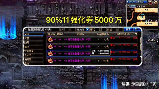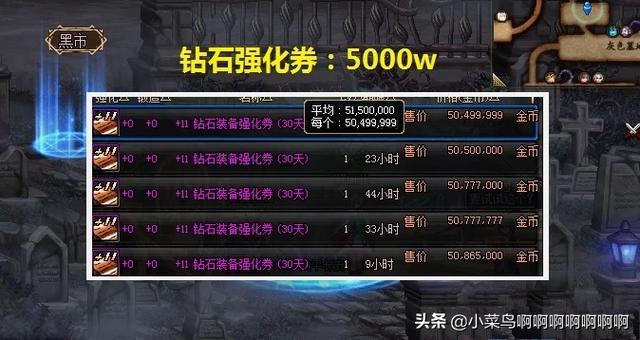 当然了,这不重要,然后我们再搜一下+11的“钻石强化券”,目前的价格为5000w,到目前为止呢,这个价格还算正常,钻石强化券成功几率比翡翠强化券更高,价格当然也就更贵,虽然贵得不多,但起码还遵守了这个逻辑嘛。