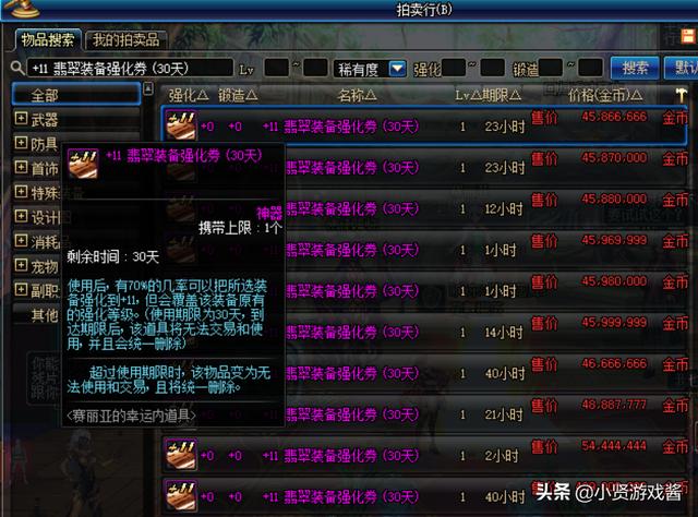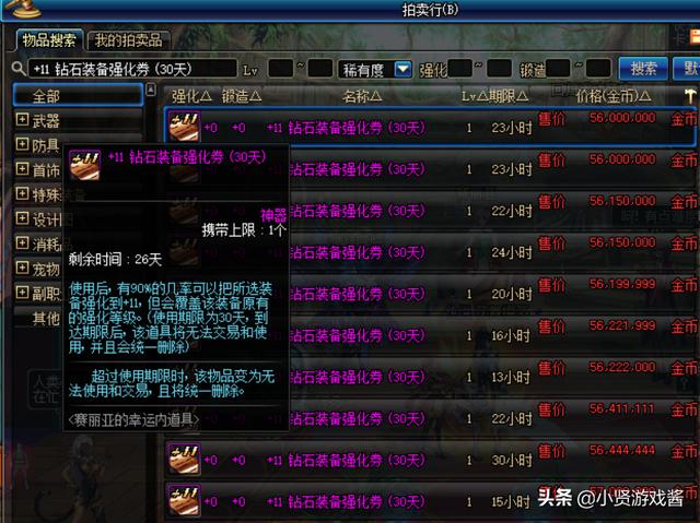 想要在春节版本强化的玩家,在拍卖行上面搜索的时候,不妨看看最下面,往往越好的东西也在越后面,想要冲击12的玩家,不要去买翡翠和钻石强化卷了,为何不以低价格买100%成功率的11装备强化卷呢?