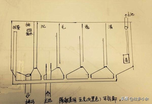 3.最后就是过滤升级。因为鱼池扩大或者加深,水体会增多,以后鱼也会增多,所以过滤改善很重要。(注意:沉淀槽内出水口要高于底部三十公分)相信建过鱼池的锦鲤饲养者都知道这点,主要是利用水的张力、重力等,让水流顺利的循环流动。过滤池的分隔页应该很清楚,要看情况而定,大多数情况下都是分为4个仓:沉淀仓、毛刷仓、过滤仓、清水仓。还有的会增加一个仓—插管仓。