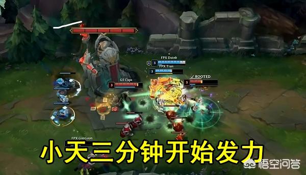 随后小天的盲僧不断发力,帮助队友不断地扩大优势。而本场比赛小天的神之一脚还是要从火龙处的团战说起。这场比赛火龙来得比较晚,但是依旧是双方队员争夺的点。在G2占领视野优势的情况下也是率先将火龙击杀。FPX并不打算撤退,轮子妈直接开启大招强势开团。