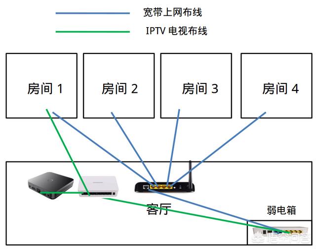 客厅布线:弱电箱到客厅至少拉两条网线,一条用于连接IPTV电视盒子,一条用于连接客厅的无线路由器;