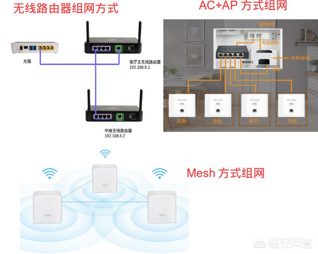 mesh路由器组网:mesh路由器组网是一种无线方式,多个mesh路由器自组织、自配置,形成一个全连接的网格网络,相比无线中继方式组网网络稳定性要高很多。