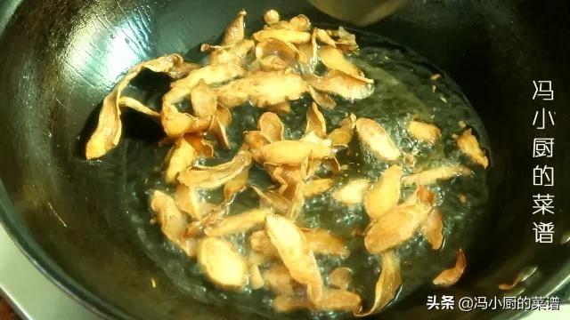 热锅下油,5分热,放入切好的姜片,中小火慢慢煎干,直到姜片水分蒸干、变金黄、微卷、,在翻炒一会,出锅备用,油留在锅里