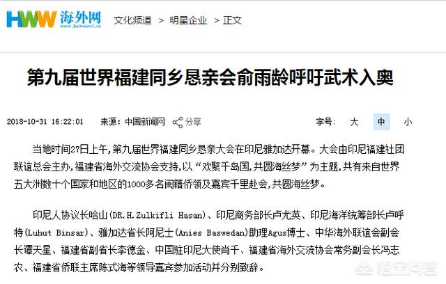 第九届世界福建同乡恳亲大会主席、印尼福建社团联谊总会俞雨龄主席大力呼吁助力武术入奥,以海纳百川的气度与世界分享中华优秀传统文化,他表示今后将呼吁海内外中华儿女参与助力武术入奥,使助力武术入奥成为推动中华文化融入世界大舞台的桥梁和纽带。