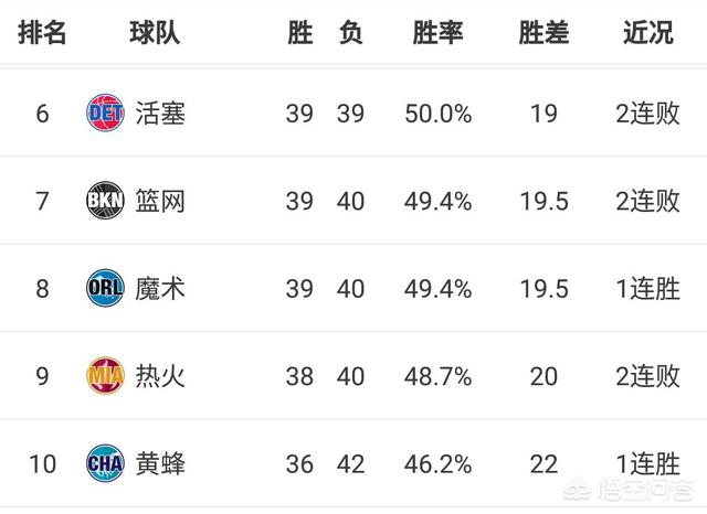首先回答一下:热火还是有希望进入季后赛的,东部目前6--8名还没有确定,活塞、篮网、魔术、热火、黄蜂五队在争夺最后的三个名额。目前东部6-10名排名如下: