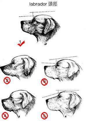 金毛的头部特征是头骨比较宽、额头线条明显。拉布拉多同样也是头骨、额头较宽,但是根据AKC对拉布拉多犬的标准,拉布拉多的脑袋与前脸处是水平相接的,这一点是有不同的。下图为纯种拉布拉多的AKC标准脸型。