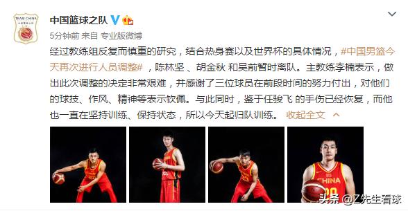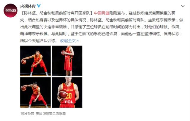 中国篮球之队更新微博写到“经过教练组反复而慎重的研究,结合热身赛以及世界杯的具体情况,中国男篮再次进行人员调整,陈林坚,胡金秋和吴前暂时离队,主教练李楠表示此次调整决定非常艰难,并且感谢了三位球员在前段时间的付出,对他们的球技作风,精神等表示钦佩,与此同时,鉴于任俊飞的手伤已经恢复,并且也一直在坚持训练,保持状态,所以今天起归队训练。”