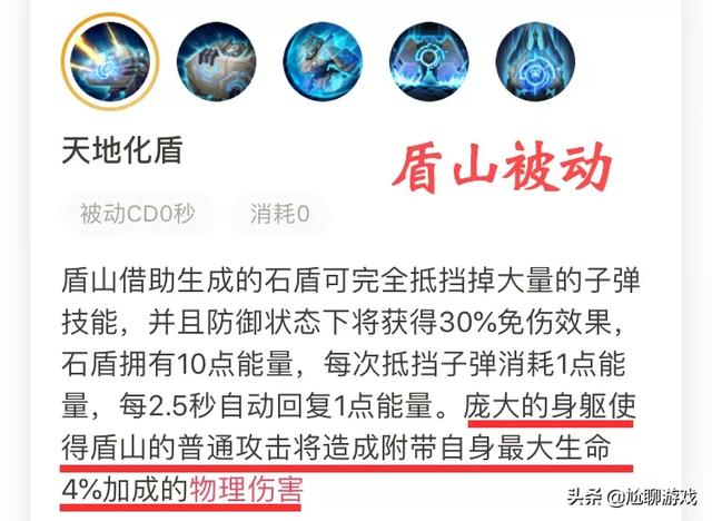 由于被动技能的存在,盾山的普攻伤害由两部分组成:常规物攻数值+自身最大生命值4%的额外伤害。不计算铭文、皮肤加成的情况下,盾山初始生命值为3361点,初始物攻为207点。