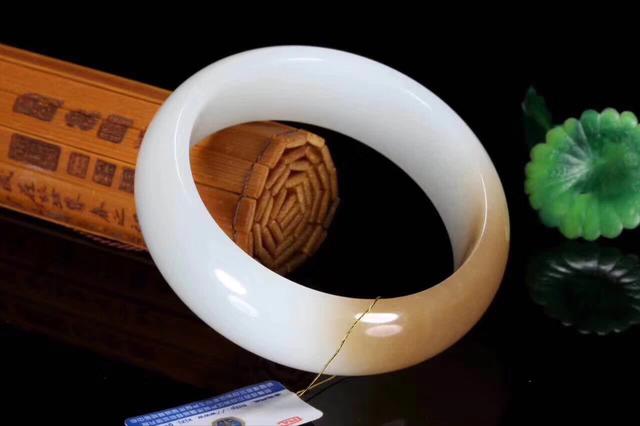 这是一支俄料手镯,油脂好,颜色略闪淡黄,有明显的絮状结构,抛光用的也是亮光。