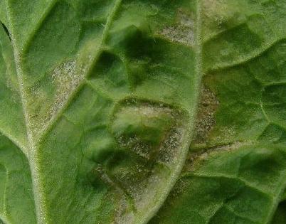 霜霉病一般先从下部叶片开始发病,发病初期产生淡绿色水渍状小点,病斑边缘不明显,后期发展为黄色不规则病斑,湿度大时叶背产生灰白色霉层,逐渐变为深灰色。棚室内干旱时病叶逐渐变黄、干枯,空气湿度大时发病叶片霉烂。