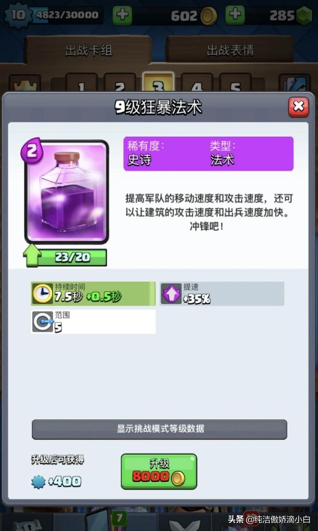 狂暴法术可以让我们的X连弩增加我们的35%的速度产生我们的最大的伤害,但是需要注意一定是要避开对面有对空和远距离的卡牌。
