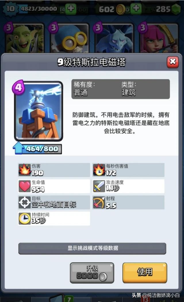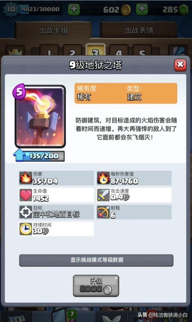 地狱塔可以配合低于一些大肉的卡牌,巨人和皮卡都是可以的,但是需要注意不要靠着对面太近。 给一点发挥的空间。