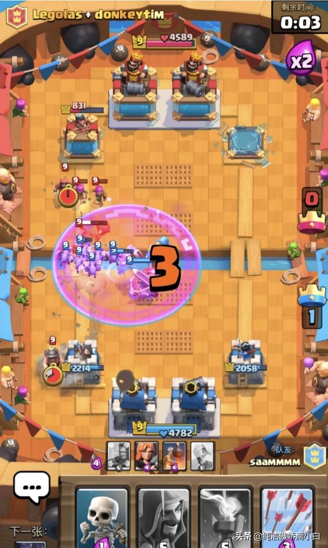 我们的连弩的位置也有两种地方 ,一种是我们的边缘直接打对面的公主塔,一种是在我们的国王塔前面防守,我们可以根据场面的情况来调整,如果对面有克制连弩的卡牌我建议先猥琐防御。找机会攻击对方公主塔。