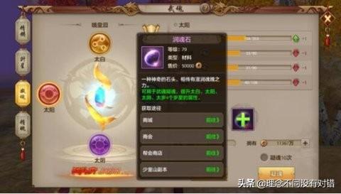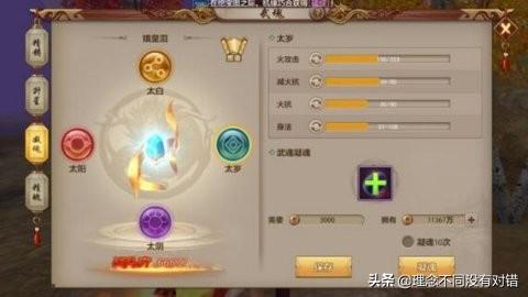 耀眼的武魂四周紧紧围绕着4个岁星,分别是太白、太岁、太阴、太阳。他们的缠绕使得武魂更加的神秘与高深莫测。少侠使用润魂石和铜板可以对任意岁星进行凝魂,提升战力。