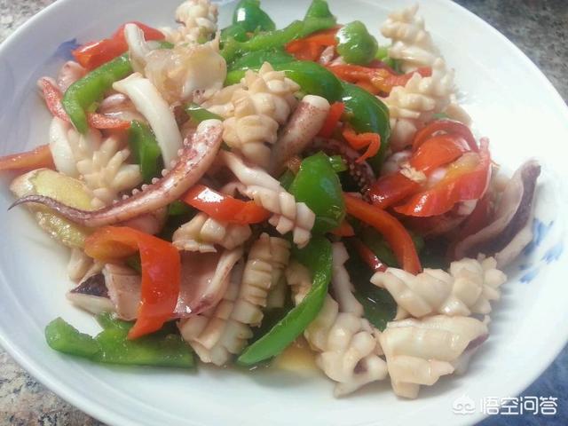 青椒炒章鱼:柿子椒2个,洗净切丝,章鱼2只,洗净切段。葱花,味极鲜,精盐,蚝油,料酒适量。