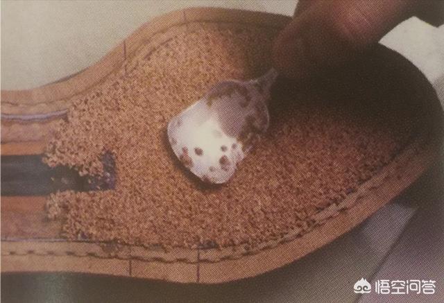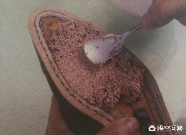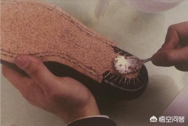 04.将混合了白乳胶的软木屑涂在内底上,用勺子按压均匀。