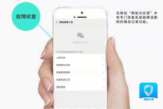 有些微信聊天记录不是人为操作误删除的,而是系统的原因造成聊天记录删除,比如网络不好、手机内存不足等,都会导致微信闪退,造成微信记录删除。对于这种情况删除的微信记录,可以利用微信的故障修复进行恢复,具体操作是打开微信的“帮助与反馈”,进入后选择“聊天记录修复”即可恢复。