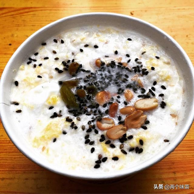 5碗里放核桃仁、杏仁、花生碎,撒上黑芝麻,倒上牛奶鸡蛋醪糟,加少许糖即可
