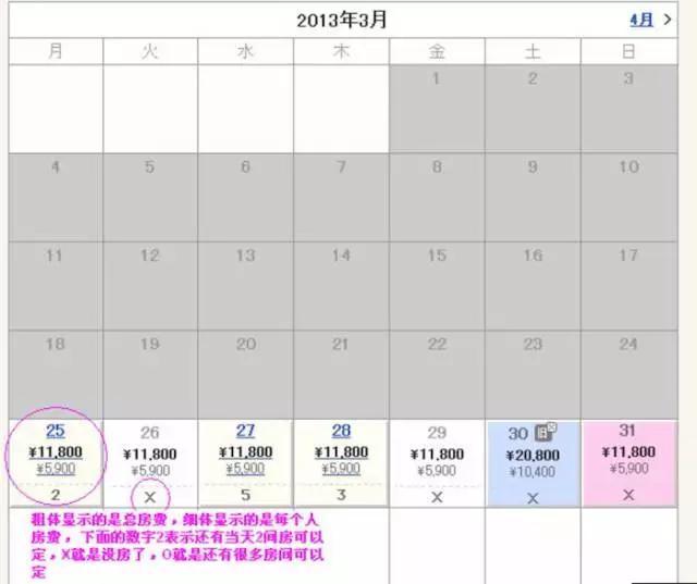 如果你没有指定入住日期,那么就会有该房型的日历,显示不同日期的不同房费,是否还有房间:
