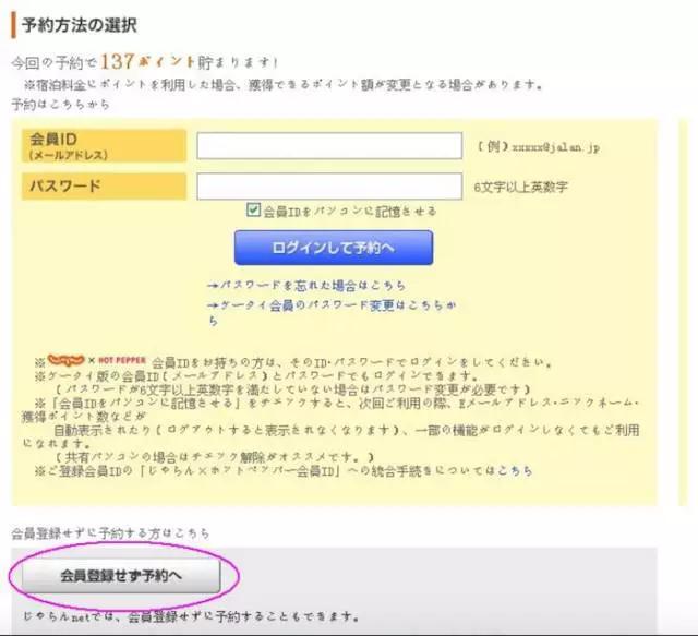 如果你没有注册,Jalan是允许不注册而预约的,只是可以取消不能变更,每次都要填你的个人信息,积分不能累计。按预约按钮之后,没有登录的情况下画面应该是这样,有会员的登录上面,没会员的在下面的按钮那里继续预约的步骤。