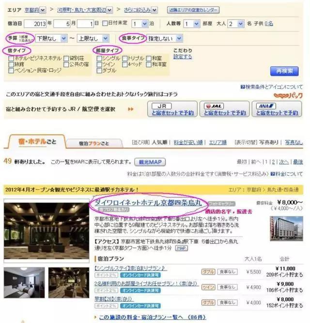 我输入日期,京都府,河原町 这样的选择条件搜索之后的搜索结果页面是这样的。