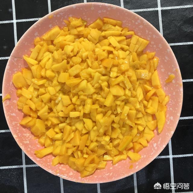 9.接下来我们来准备夹心的果肉部分。把芒果切成小颗粒,越小越好。
