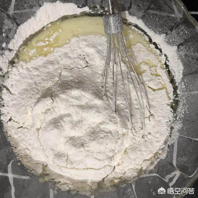 3.将高筋面粉和底筋面粉混合过筛到混合好的液体中,