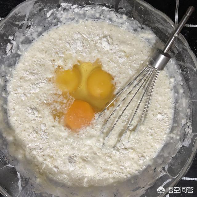 4.搅拌后打入三个鸡蛋。然后搅拌成没有颗粒的细腻面糊