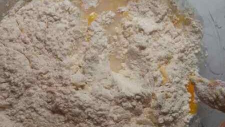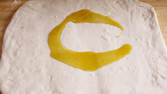 这个时候加入胡麻油,刷一层油,然后使劲揉揉,到油混合到面团儿以后再加另一层油,要有耐心。